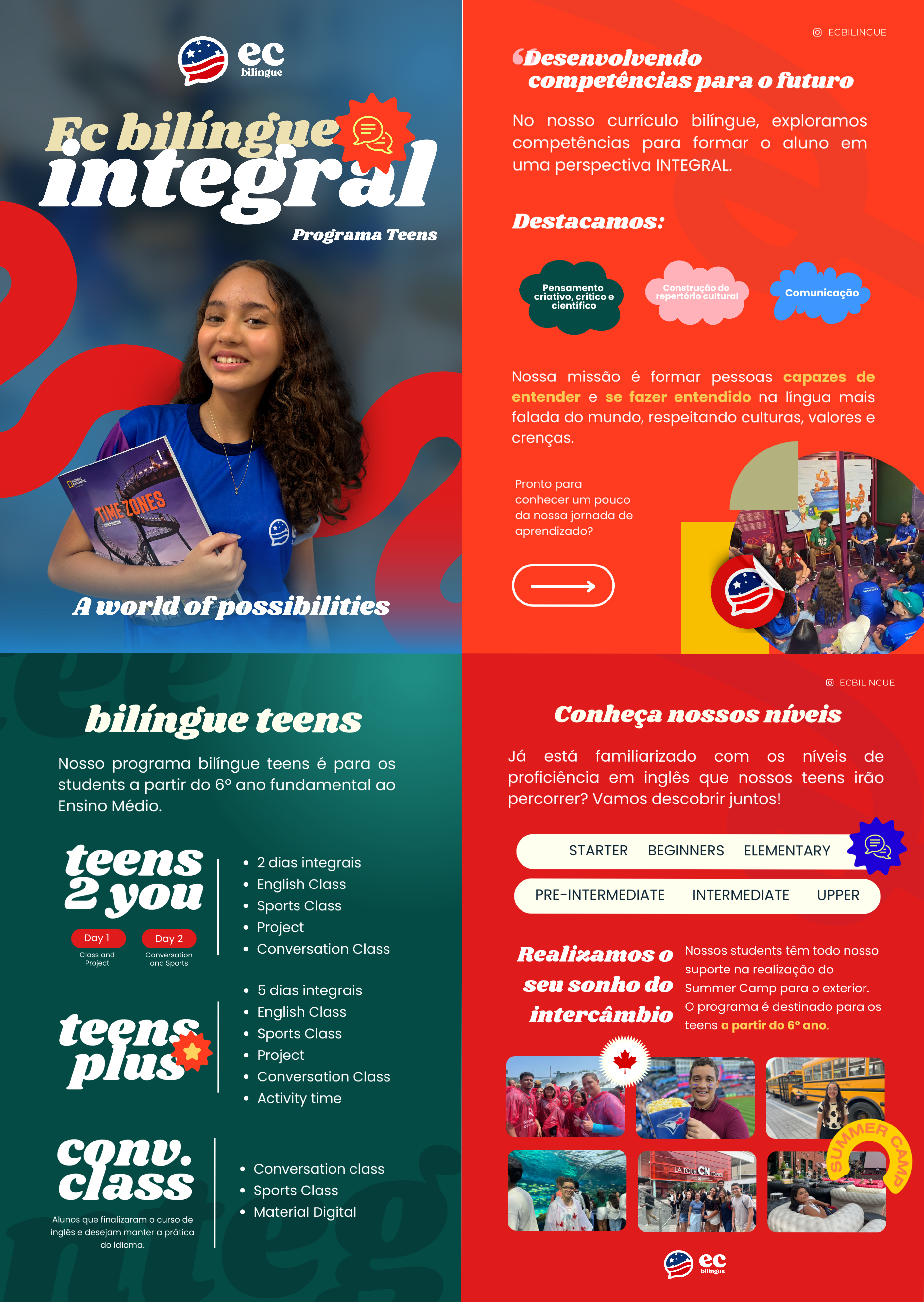 No nosso segmento TEENS, os nossos alunos estão inseridos a todo momento em um universo voltado à diversidade e multiplicidade de cultura, sotaques, valores, costumes e tradições dos vários países “all over the world”. Tudo isso sendo abordado através do idioma em questão.